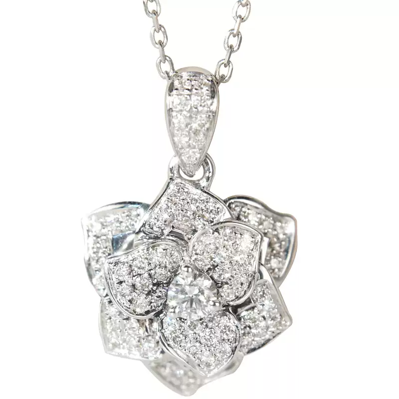 文欢珠宝 18K白金钻石项链 时尚玫瑰花砖石吊坠 群镶颈饰正品