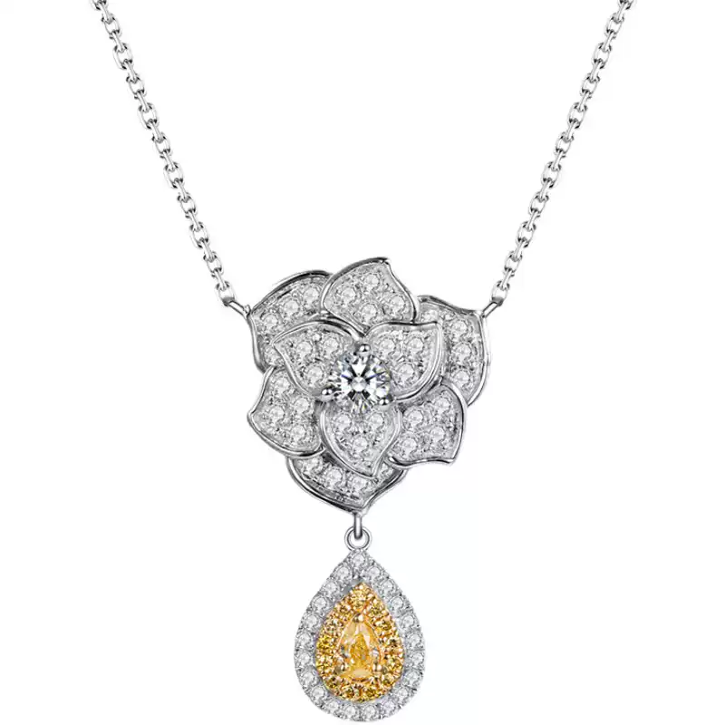 廖夫人珠宝 18K金满钻山茶花钻石吊坠群镶真钻黄钻项链颈饰定制