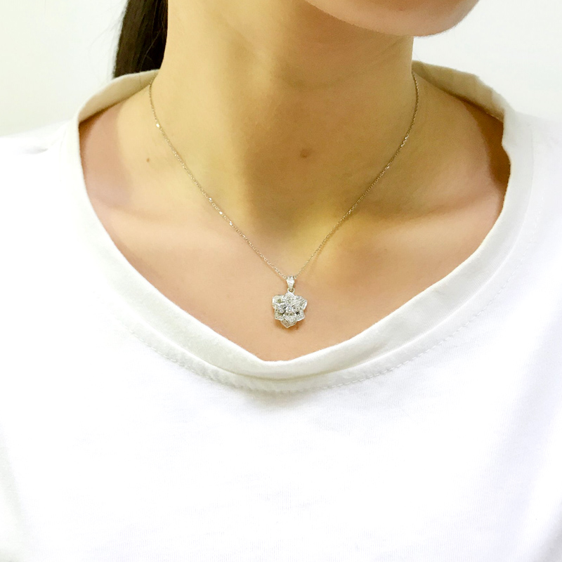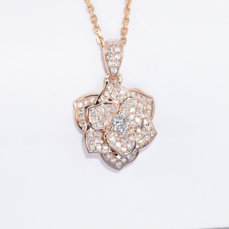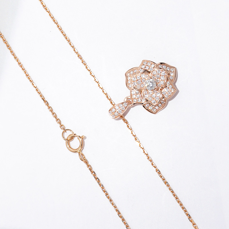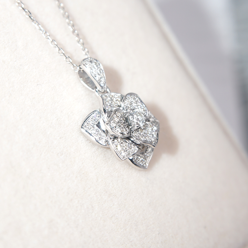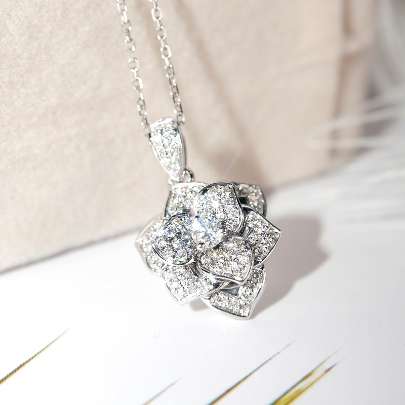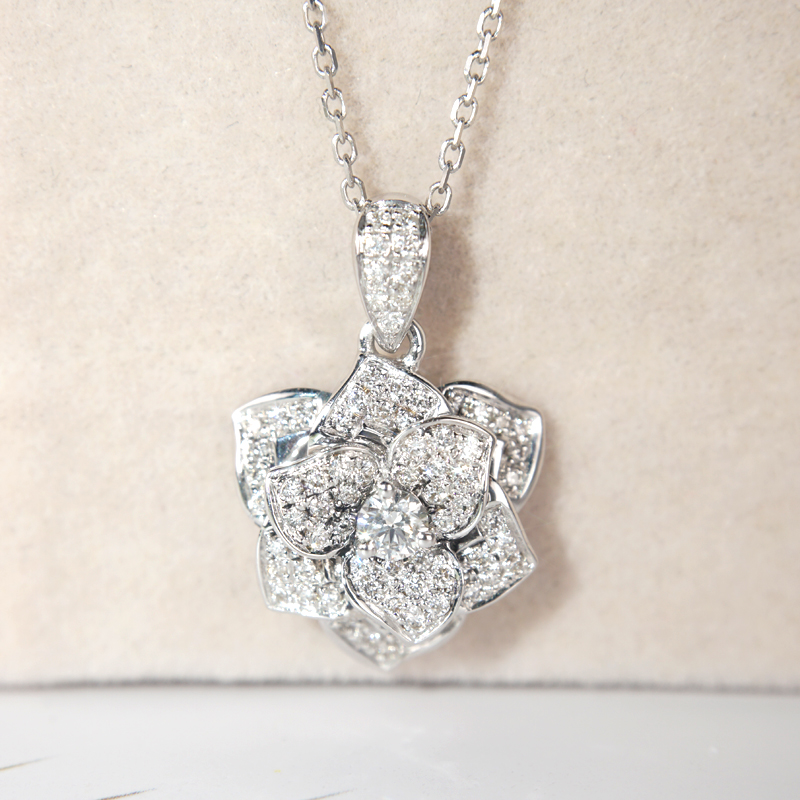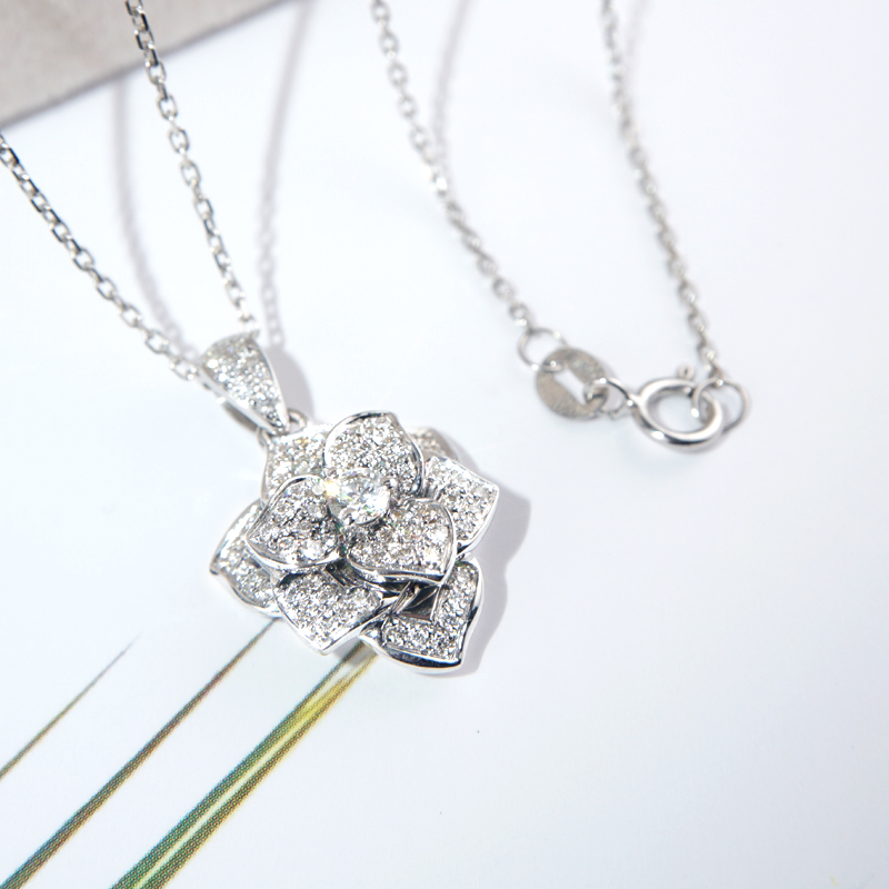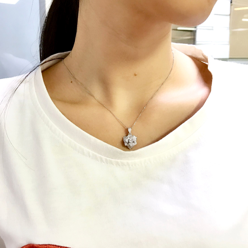 文欢珠宝 18K白金钻石项链 时尚玫瑰花砖石吊坠 群镶颈饰正品
