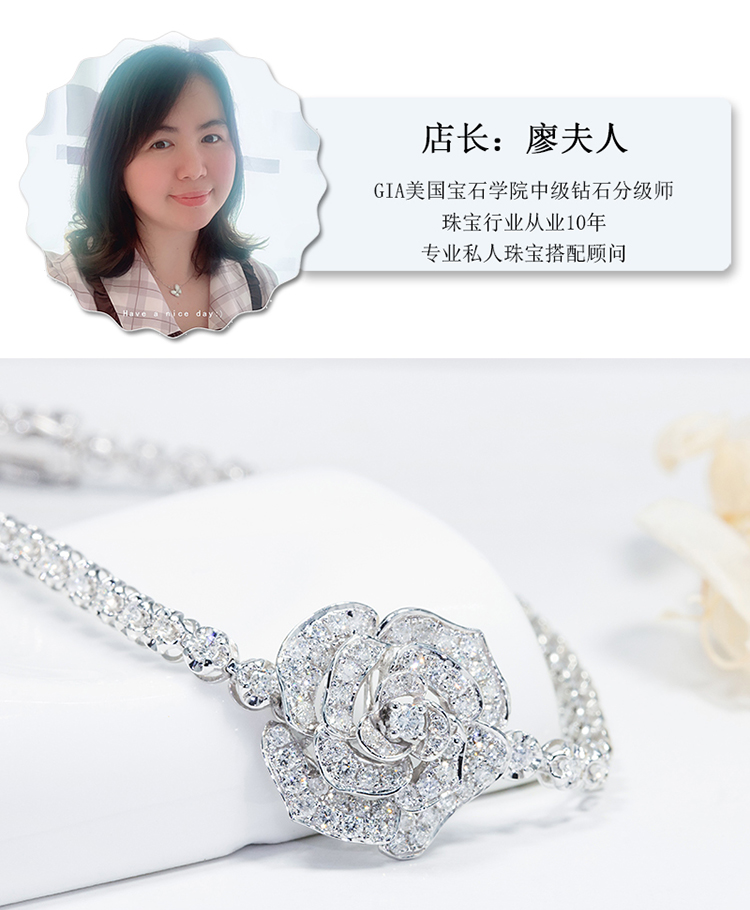 文欢珠宝 18K白金钻石项链 时尚玫瑰花砖石吊坠 群镶颈饰正品