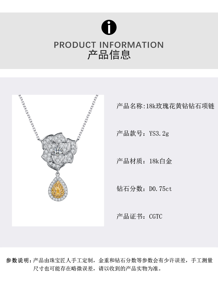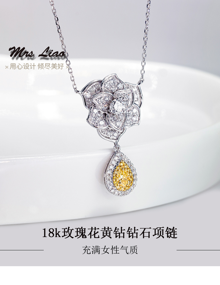 廖夫人珠宝 18K钻石项链女 满钻玫瑰花黄钻吊坠锁骨链毛衣链颈饰